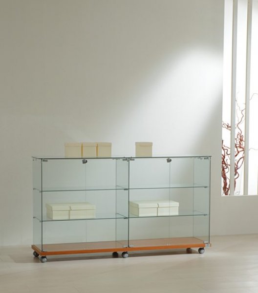 Tempered Glass, 2+2 hinged lockable doors, 2+2 shelves and base on castors