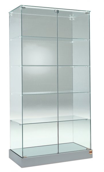 Tempered Glass, 2 Hinged Lockable Doors, 4 Shelves, Base with hidden castors